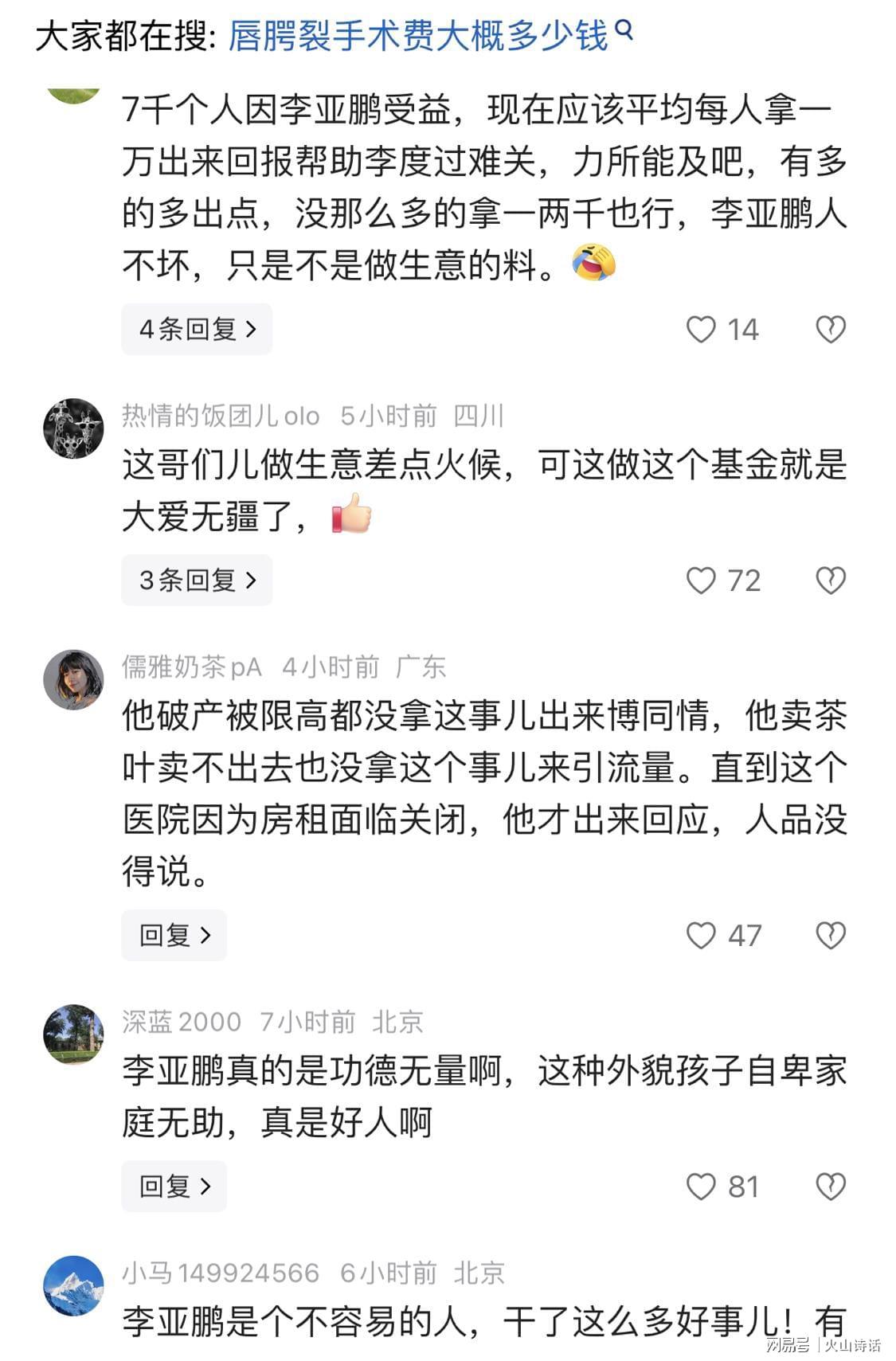 针对此事,有网友评论,7000个人因李亚鹏受益,现在应该平均每人拿一万出来回报帮助李度过难关,力所能及吧,有多的多出点,没那么多的拿一两千也行,李亚鹏人不坏,只是不是做生意的料。